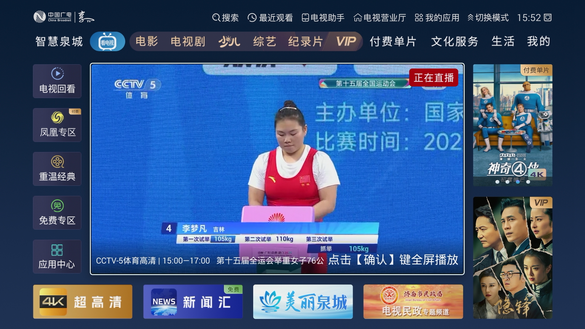 4K超高清臻享館共有十個(gè)4K頻道,頻道數(shù)量目前位于全國(guó)行業(yè)第一。在這十個(gè)4K頻道當(dāng)中,有兩個(gè)是4K直播頻道,分別是央視4K和奧林匹克頻道。還包括電影、電視劇、健身等八個(gè)4K輪播頻道。
